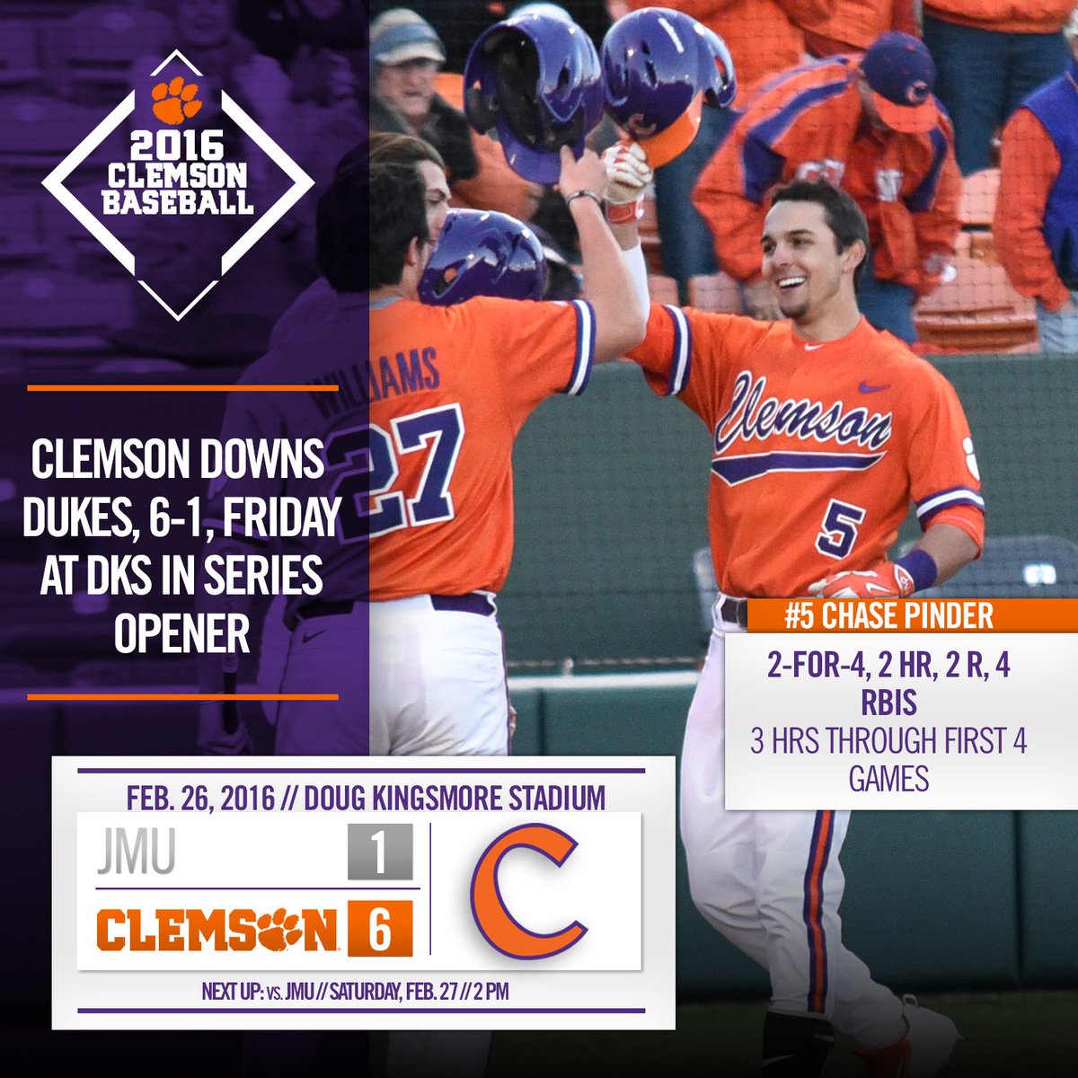 FINAL - #Clemson takes series opener from JMU, 6-1, Friday at DKS