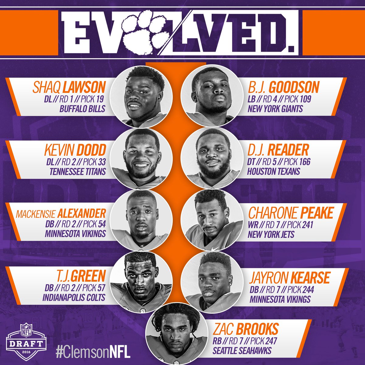 This is #Clemson, where we sent 9 Tigers to 8 teams in the 2016 #NFLDraft