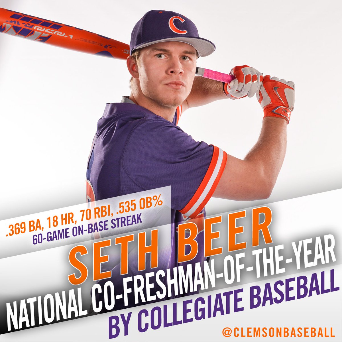 Clemson Baseball tweeted: Seth Beer named national co-freshman-of-the-year by @CBNewspaper, #Clemson's first freshman to win a national award!