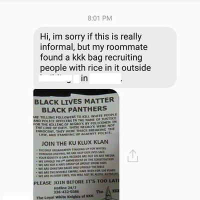 We got a msg KKK flyers were left on campus this weekend. If you have concerns ask @ClemsonPrez what is being done.